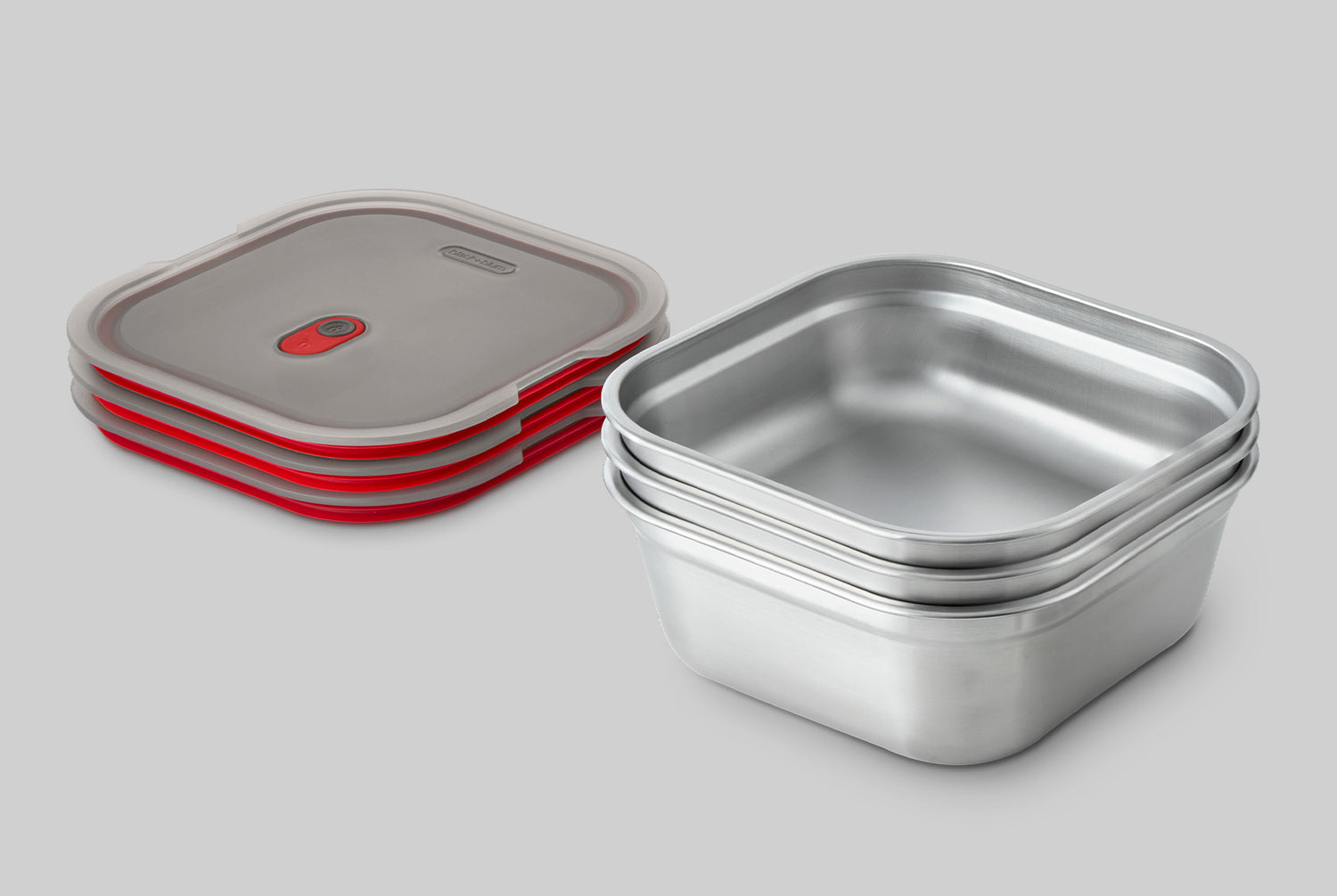 We launched our first lunch box design in 2010 and this helped inspire and ignite the whole marketplace for food on-the-go. This has led to a growing trend in meal-prep and batch cooking with people following a certain diet for health or fitness, trying to live more sustainably or simply saving money. From a design standpoint, we saw this as a great opportunity to create a range of food containers with different volumes and shapes to suit the individual user and food type. We wanted the design to be simple and minimal; stripped back to the bare essentials. The stainless steel base is surprisingly light but durable and innovative in relation to being microwave/oven/freezer-safe and easy to open with the vacuum release button.